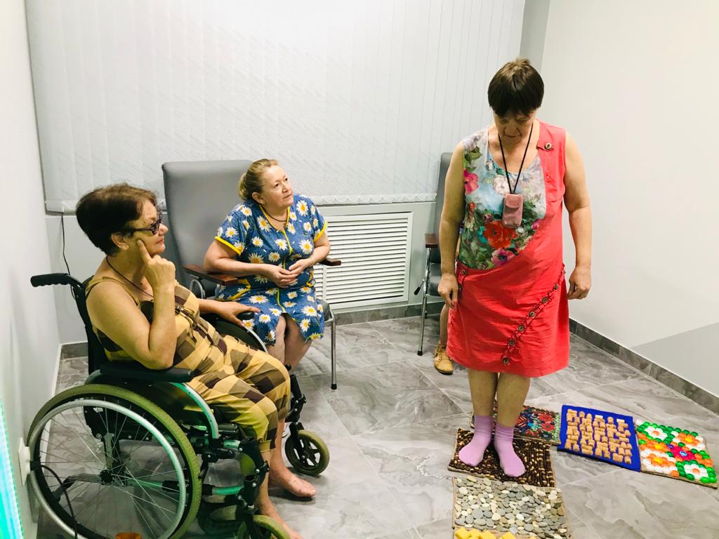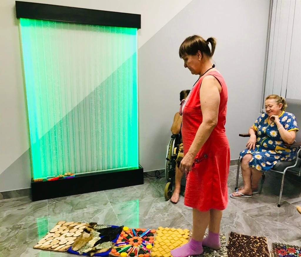 Наша дорожка состоит из нескольких секций, в каждой из которых своя поверхность: из морской гальки, пробкового покрытия, войлока, кусочков меха, поролона, деревянных спилов и других материалов. Посетив сенсорную комнату дома-интерната, каждый получатель социальных услуг получил возможность массажа подошвы стопы - скопления рефлексогенных точек, рефлекторно связанных с внутренними органами. Естественный массаж этих точек способствует оздоровлению организма.