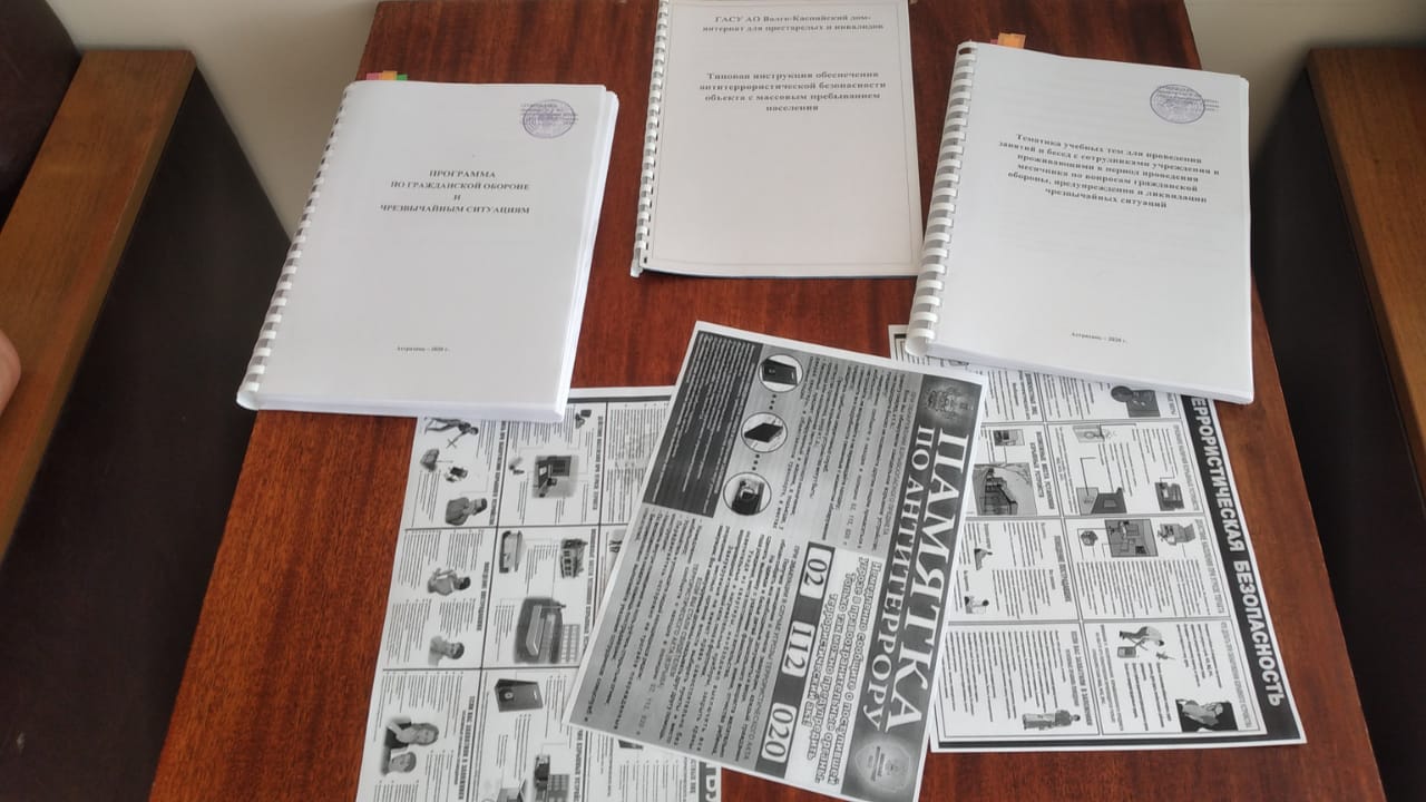 В целях реализации Комплексного плана противодействия идеологии терроризма в Российской Федерации на 2019-2023 годы в Волго-Каспийском доме-интернате продолжаются тематические занятия с сотрудниками по противодействию идеологии терроризма. В ходе занятия сотрудникам напомнили о действиях при угрозе террористических актов различного уровня опасности, действиях при сообщении о возможности террористического акта, обнаружении подозрительных предметов.