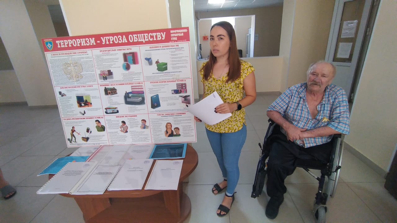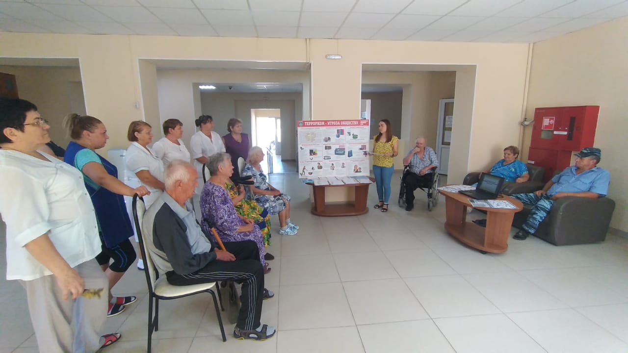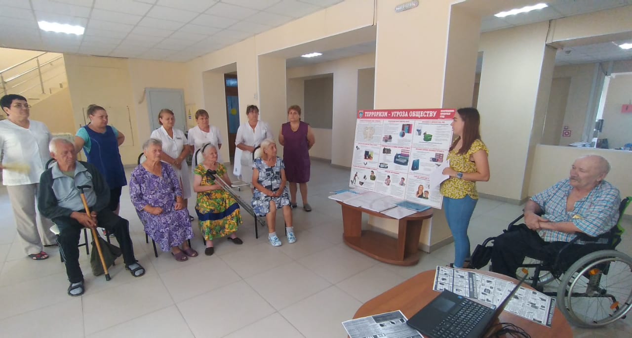 В преддверии празднования дня солидарности в борьбе с терроризмом сотрудники и получатели социальных услуг Волго-Каспийского дома-интерната приняли участие в мероприятии по реализации Комплексного плана противодействия идеологии терроризма в Российской Федерации, просмотрели презентацию на тему «Действия при угрозе терроризма», минутой молчания почтили память жертв теракта в Беслане.