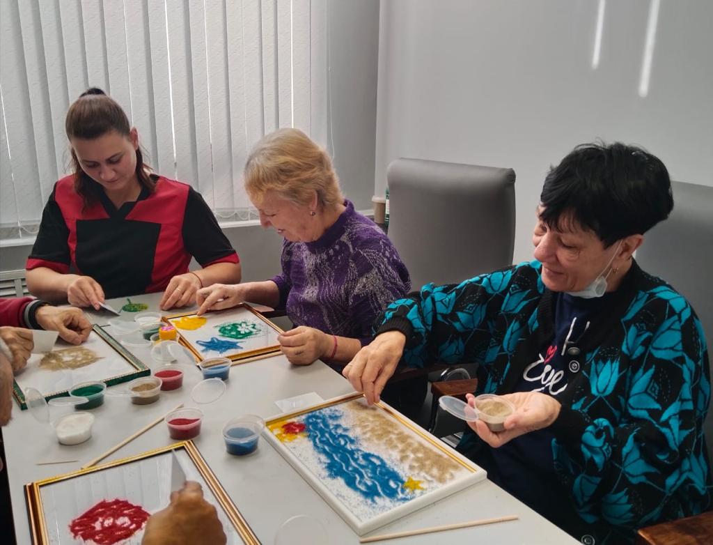 В Волго–Каспийском доме-интернате было проведено коррекционное терапевтическое занятие «Магия песка». Участники занятия создавали индивидуальные картины и образы из цветного песка. В процесс взаимодействия с песком получатели социальных услуг вовлеклись полностью, задействуя все свои качества: физические, эмоциональные, интеллектуальные и социальные.