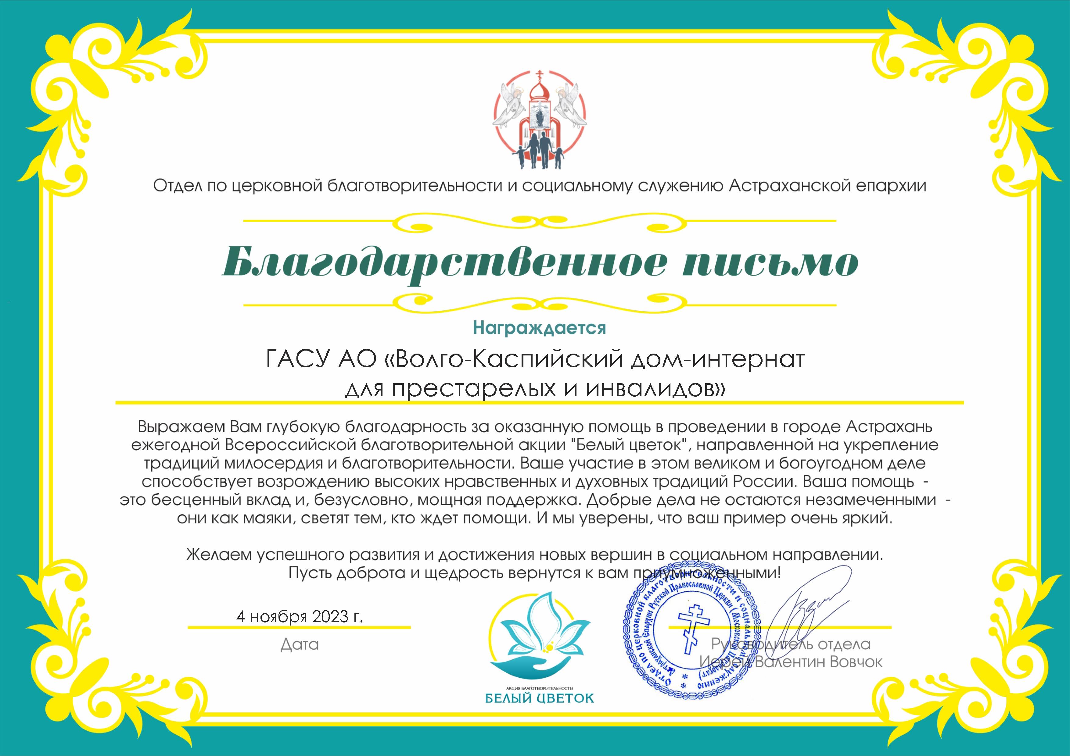 Акция благотворительности «Белый цветок», которая призвана объединить людей с добрым сердцем для общей цели – помочь тяжелобольным детям. проводится в городе Астрахани с 2017 г. Большой вклад в доброе дело вносят школьники, дети из социальных учреждений, из центров дополнительного образования, воскресных школ и православной гимназии, которые своими руками создают белые цветы. По традиции, волонтеры предлагают горожанам купить цветы – живые или искусственные – по цене, которую назначат сами покупатели.