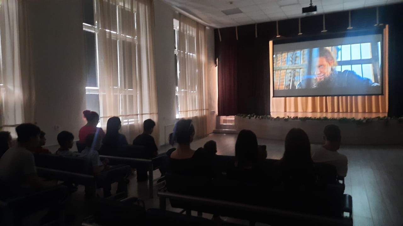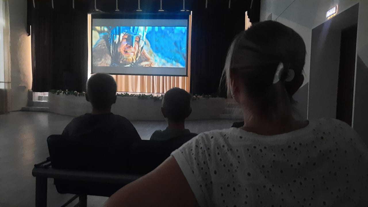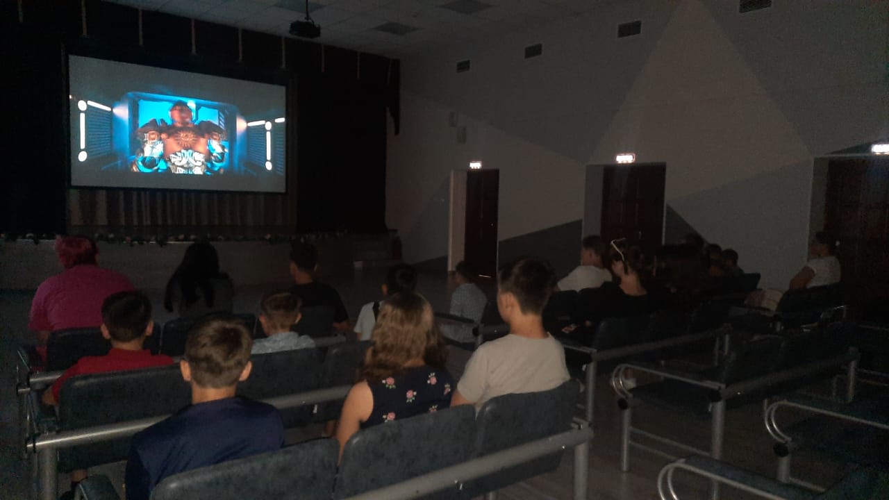 Используя методы кинотерапии из программы «Мир волшебного кино», в прекрасном зале на большом экране, вниманию детей был представлен кинофильм «Соловей против Муромца», давший детям возможность сопереживать главному герою и верить в его добрые силы, которые всегда побеждают зло.