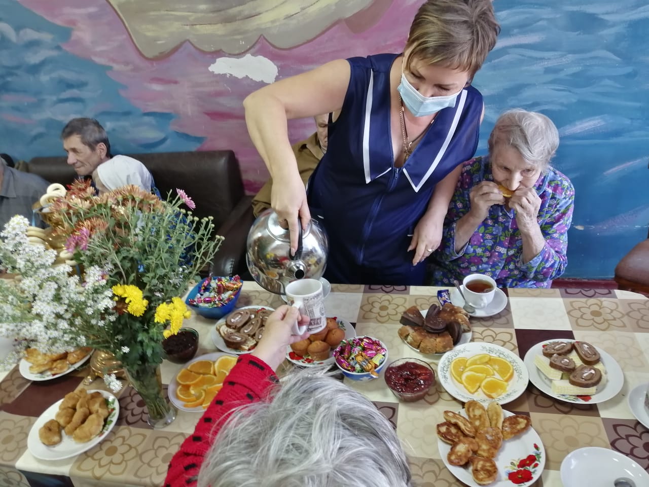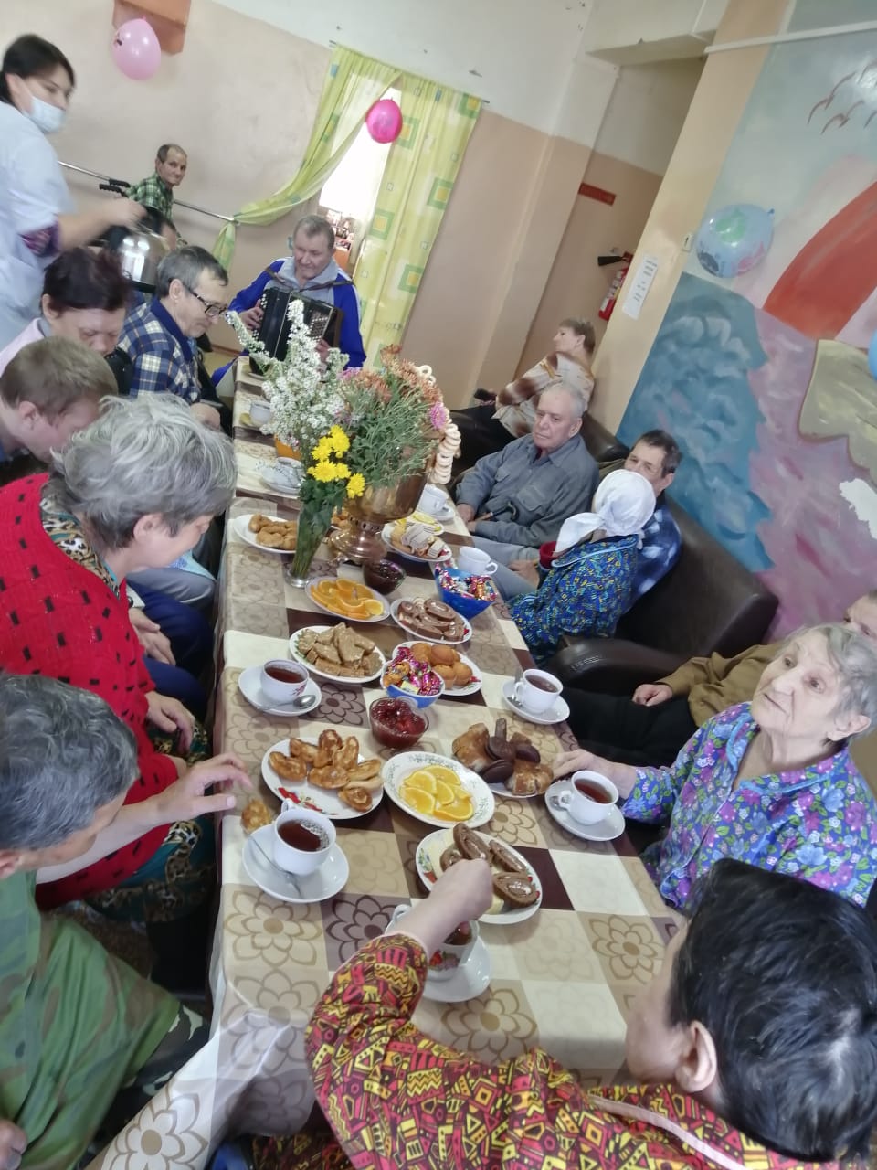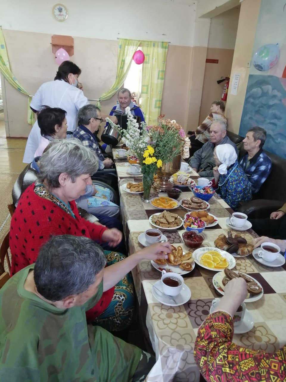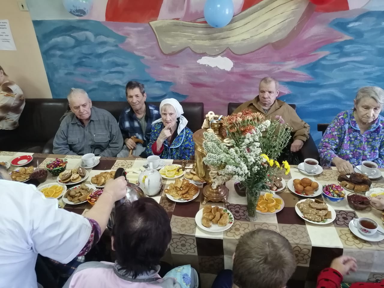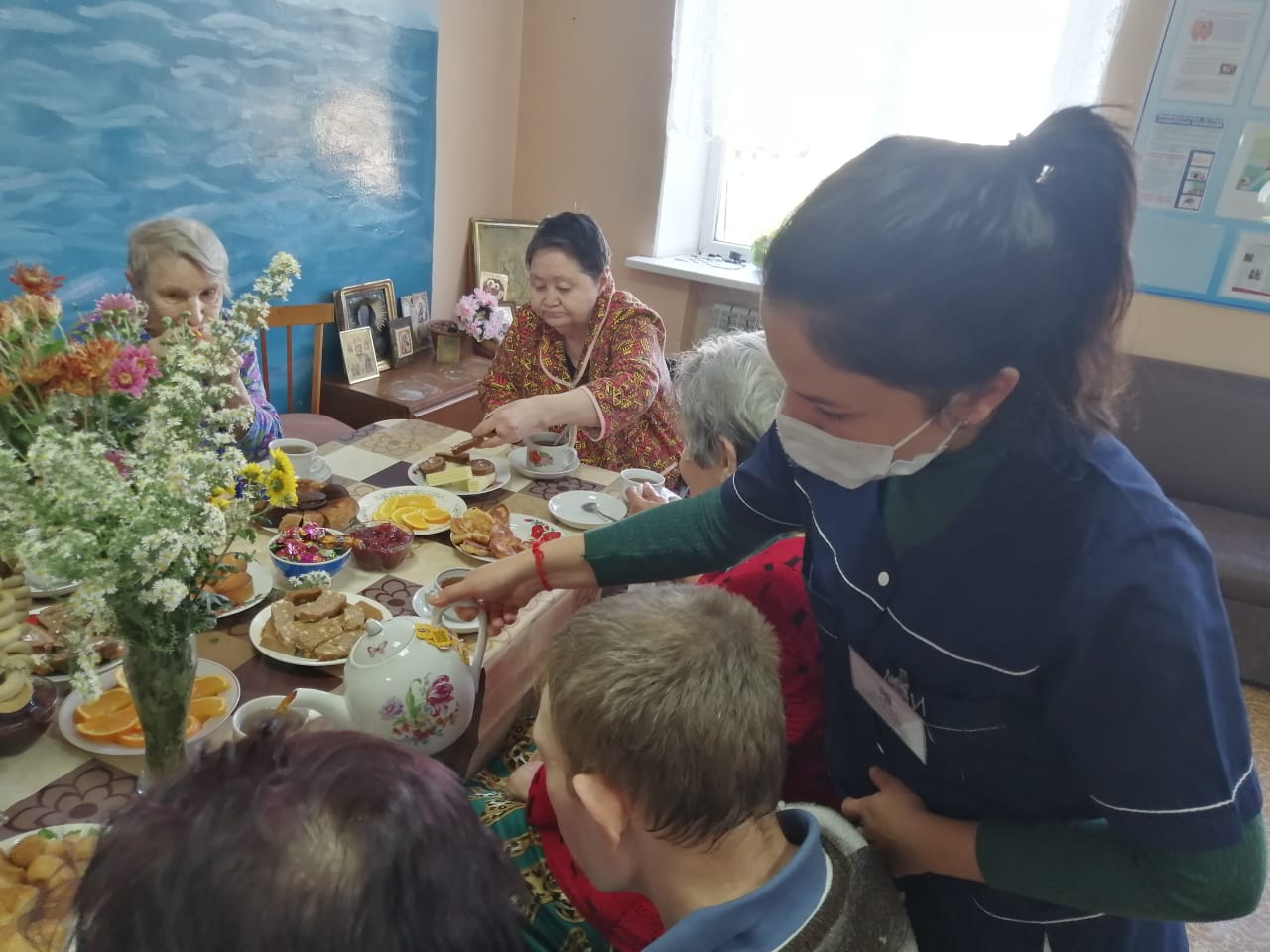 В доме-интернате проживающим вручены сладкие подарки, в каждом отделении накрыты чайные столы, играет музыка.